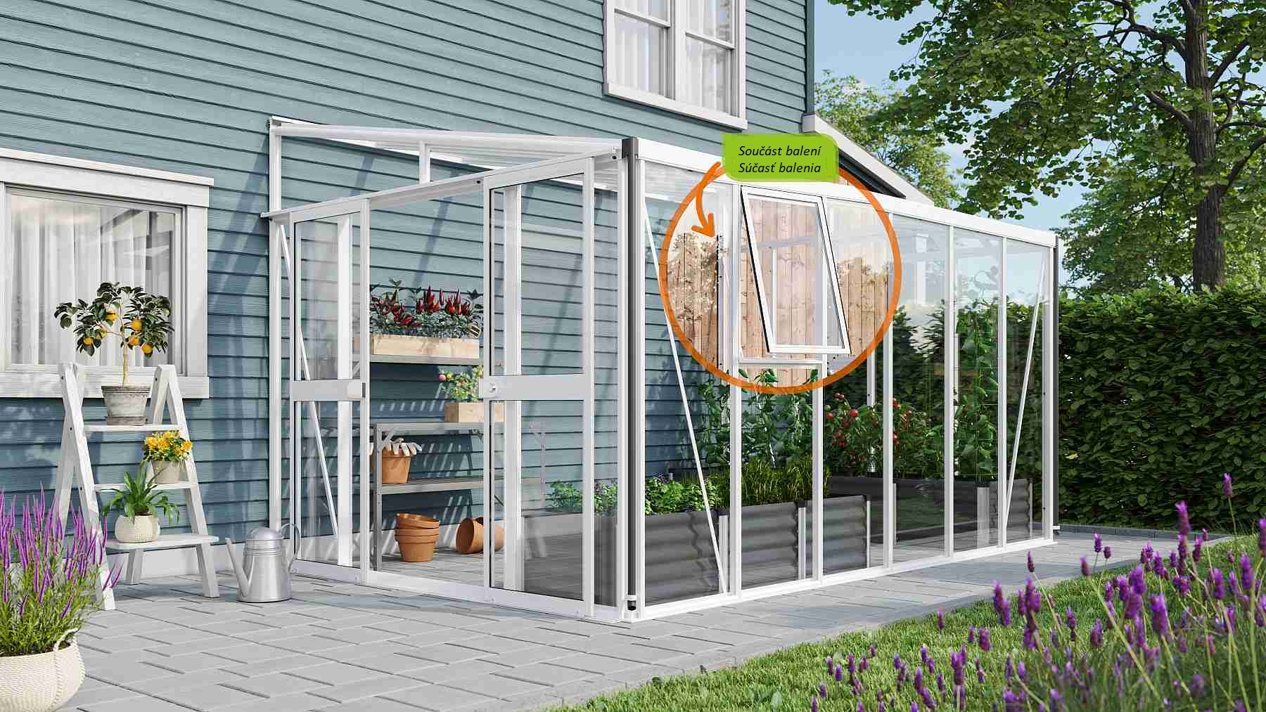 Obsahem balení jsou dvoukřídlé posuvné dveře (š x v otvoru = 1,19 x 1,77 m), AL profily, prosklení, 2x boční ventilační okénko s manuálním otevíráním, 1x okapový žlab včetně dvou svodů, 1x cylindrický zámek a veškerý spojovací materiál. Ke skleníku je možné dokoupit řadu nadstandardního příslušenství - poličky, regály, další větrací střešní i boční okénka, automatické otvírače k těmto okénkům, teploměry, vlhkoměry, zavlažovací zařízení, elektrické odporové vytápění půdy. Baleno v papírovém kartonu. Prosklení je zabalené v nevratné dřevěné bedně.