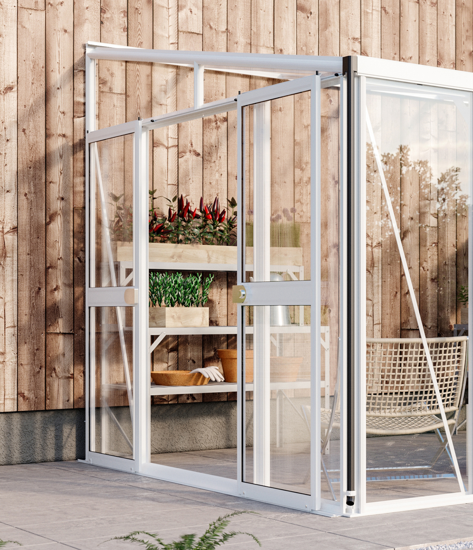 Skleník je určen k montáži ke zdi – zadní stěna není součástí konstrukce.