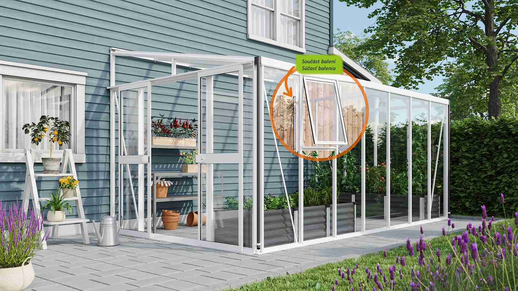 Obsahem balení jsou dvoukřídlé posuvné dveře (š x v otvoru = 1,19 x 1,77 m), AL profily, prosklení, 3x boční ventilační okénko s manuálním otevíráním, 1x okapový žlab včetně dvou svodů, 1x cylindrický zámek a veškerý spojovací materiál. Ke skleníku je možné dokoupit řadu nadstandardního příslušenství - poličky, regály, další větrací střešní i boční okénka, automatické otvírače k těmto okénkům, teploměry, vlhkoměry, zavlažovací zařízení, elektrické odporové vytápění půdy. Baleno v papírovém kartonu. Prosklení je zabalené v nevratné dřevěné bedně.