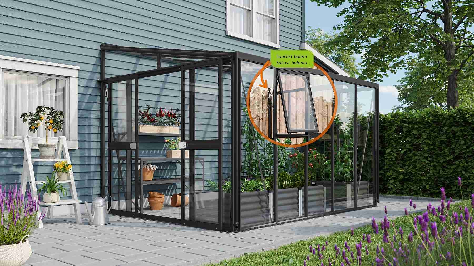 Obsahem balení jsou dvoukřídlé posuvné dveře (š x v otvoru = 1,19 x 1,77 m), AL profily, prosklení, 2x boční ventilační okénko s manuálním otevíráním, 1x okapový žlab včetně dvou svodů, 1x cylindrický zámek a veškerý spojovací materiál. Ke skleníku je možné dokoupit řadu nadstandardního příslušenství - poličky, regály, další větrací střešní i boční okénka, automatické otvírače k těmto okénkům, teploměry, vlhkoměry, zavlažovací zařízení, elektrické odporové vytápění půdy. Baleno v papírovém kartonu. Prosklení je zabalené v nevratné dřevěné bedně.