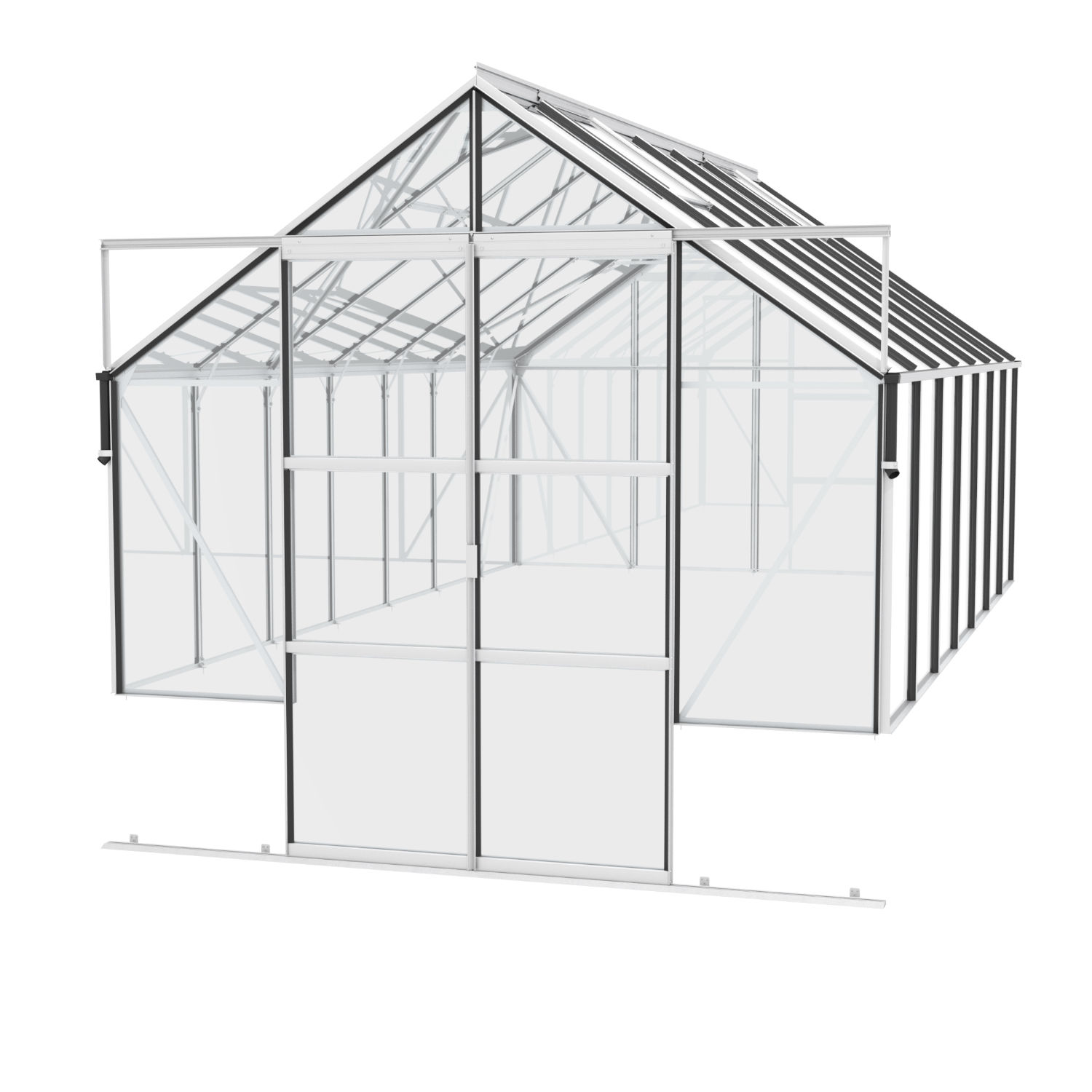 Obsahem balení jsou dvoukřídlé posuvné dveře (š x v otvoru = 1,22 x 1,94 m), AL profily, prosklení, 4x střešní ventilační okénko s manuálním otevíráním, veškerý spojovací materiál. Ke skleníku je možné dokoupit řadu nadstandardního příslušenství - poličky, regály, další větrací střešní i boční okénka, automatické otvírače k těmto okénkům, okapové sady, teploměry, vlhkoměry, zavlažovací zařízení, elektrické odporové vytápění půdy.