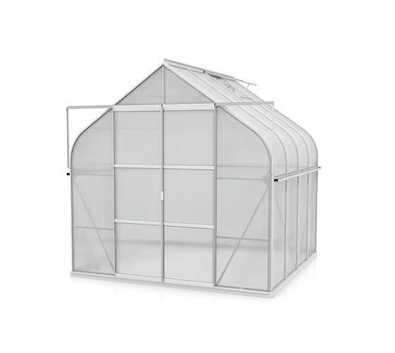 Obsahem balení jsou dvoukřídlé posuvné dveře (š x v otvoru = 1,22 x 2,00 m), AL profily, prosklení, pozinkovaná ocelová základna, 2x střešní ventilační okénko s manuálním otevíráním, veškerý spojovací materiál. Ke skleníku je možné dokoupit řadu nadstandardního příslušenství - poličky, regály, další větrací střešní i boční okénka, automatické otvírače k těmto okénkům, okapové sady, teploměry, vlhkoměry, zavlažovací zařízení, elektrické odporové vytápění půdy.