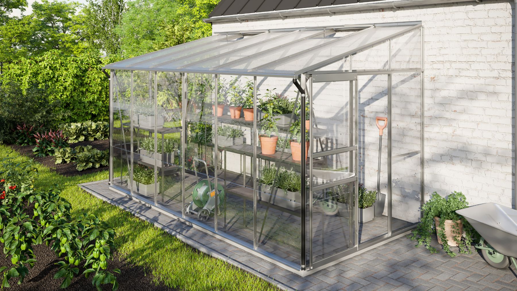 Skleník je určen k montáži ke zdi – zadní stěna není součástí konstrukce.