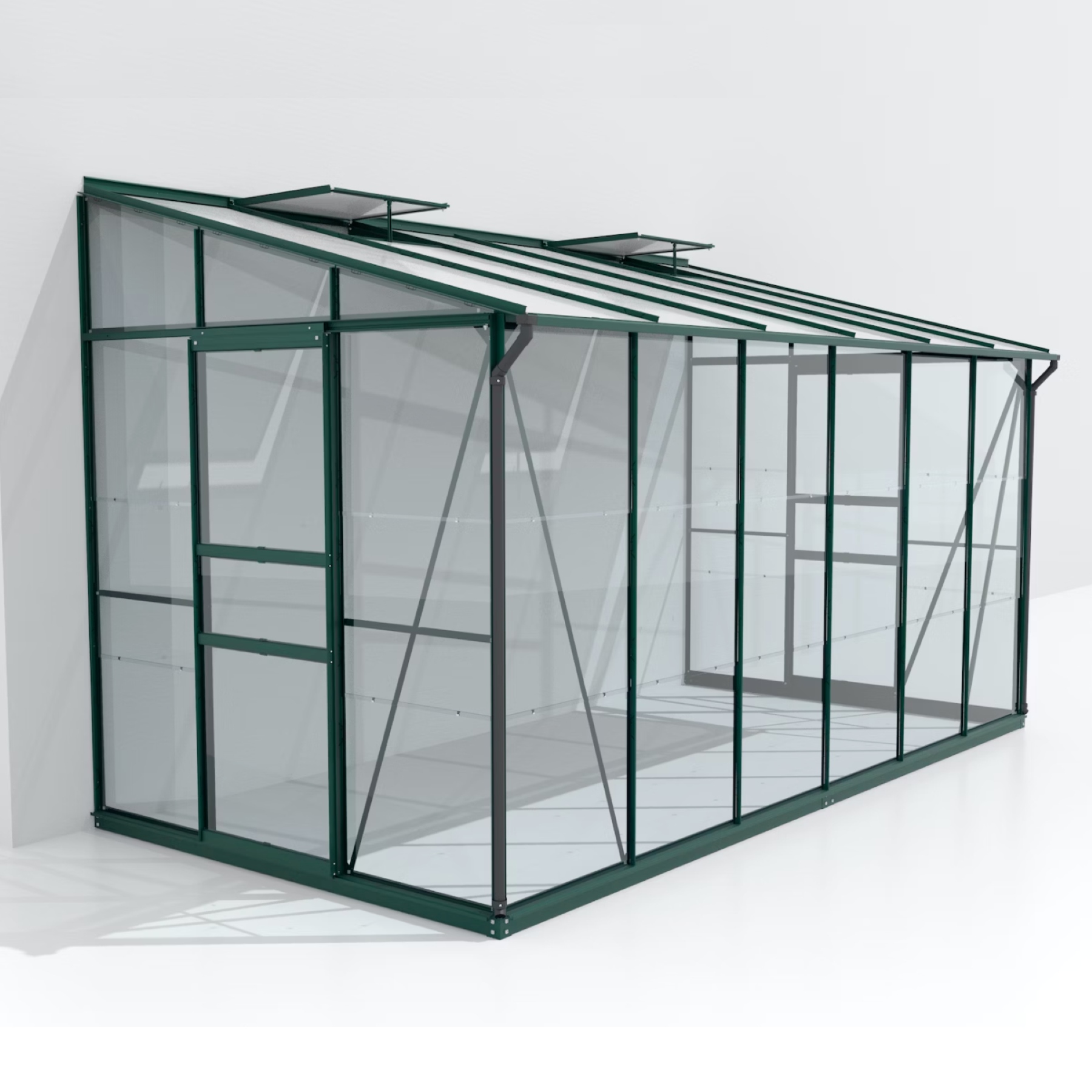 Skleník je vybaven dvoukřídlými dveřmi (1,22 x 1,63 m), AL profily, prosklením, 2x střešním ventilačním okénkem s manuálním otevíráním, veškerým spojovacím materiálem. Skleník lze postavit buď na zděnou podezdívku (pak není nutné dokupovat základnu z pozinkovaného plechu) nebo na základnu z pozinkovaného plechu (nutno dokoupit). Při stavbě bez zděné podezdívky dokoupení základny určitě doporučujeme. Ke skleníku je možné dokoupit řadu nadstandardního příslušenství - poličky, regály, teploměry, vlhkoměry, zavlažovací zařízení, elektrické odporové vytápění půdy. Baleno v papírovém kartonu. Prosklení je zabalené v nevratné dřevěné bedně.