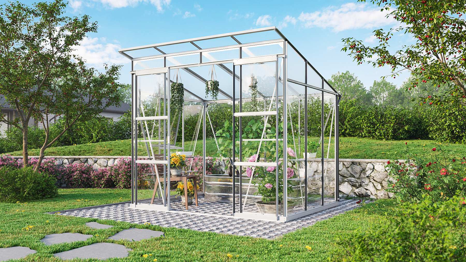 Velkou výhodou tohoto skleníku je extrémně nízký práh usnadňující používání, takže do skleníku lehce vjedete i se zahradním kolečkem.