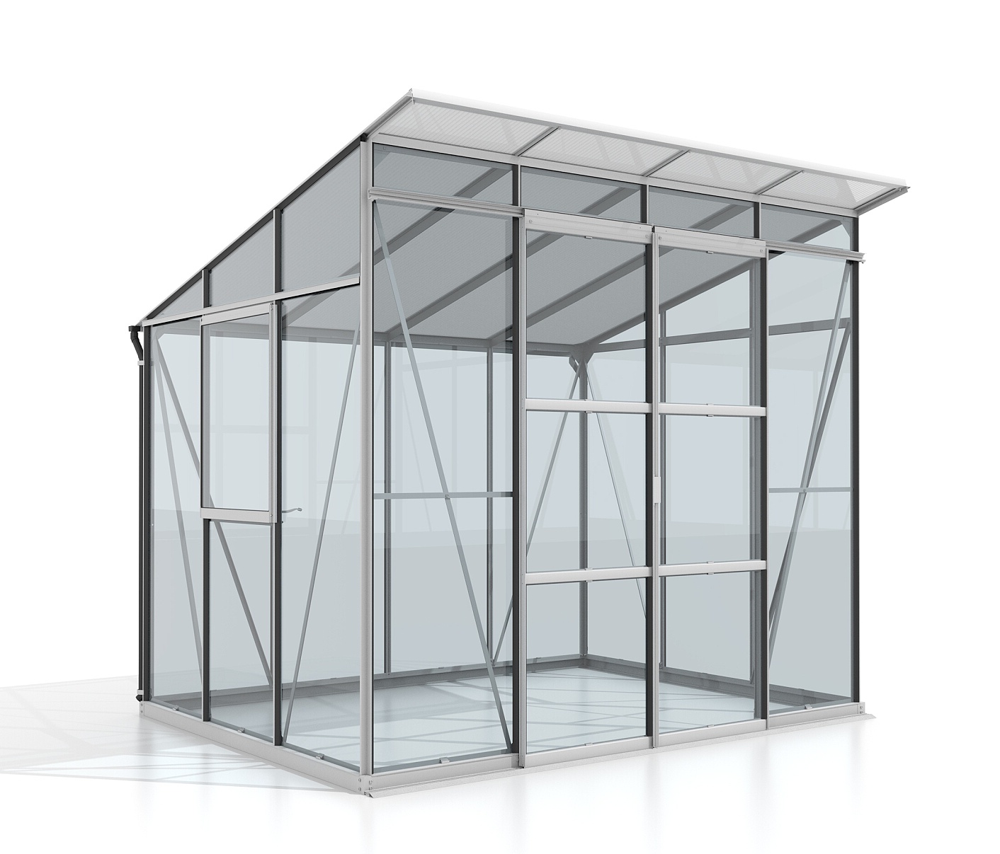 Obsahem balení jsou dvoukřídlé posuvné dveře (š x v otvoru = 1,22 x 1,92 m), AL profily, prosklení, 1x boční ventilační okénko s manuálním otevíráním, 1x okapový žlab včetně dvou svodů, veškerý spojovací materiál. Ke skleníku je možné dokoupit řadu nadstandardního příslušenství - poličky, regály, další větrací střešní i boční okénka, automatické otvírače k těmto okénkům, okapové sady, teploměry, vlhkoměry, zavlažovací zařízení, elektrické odporové vytápění půdy. Baleno v papírovém kartonu. Prosklení je zabalené v nevratné dřevěné bedně.