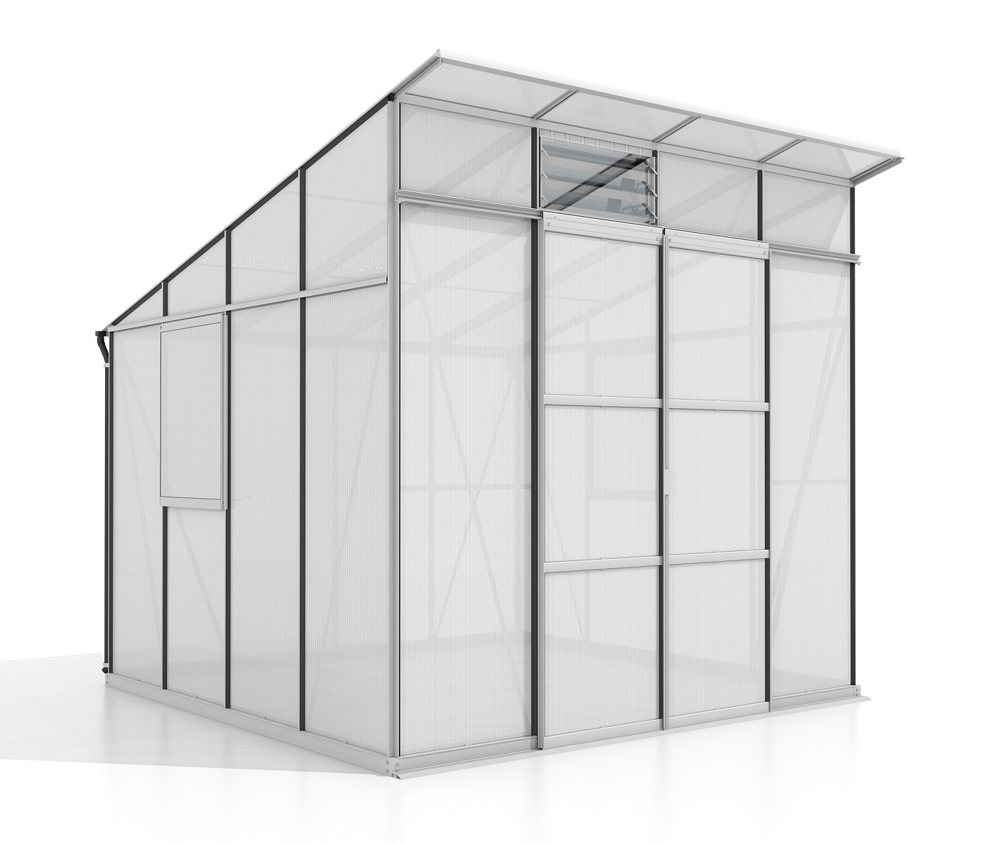 Obsahem balení jsou dvoukřídlé posuvné dveře (š x v otvoru = 1,22 x 1,92 m), AL profily, prosklení, 2x boční + 1x čelní žaluziové okénko s manuálním otevíráním, 1x okapový žlab včetně dvou svodů, veškerý spojovací materiál. Ke skleníku je možné dokoupit řadu nadstandardního příslušenství - poličky, regály, další větrací střešní i boční okénka, automatické otvírače k těmto okénkům, okapové sady, teploměry, vlhkoměry, zavlažovací zařízení, elektrické odporové vytápění půdy.