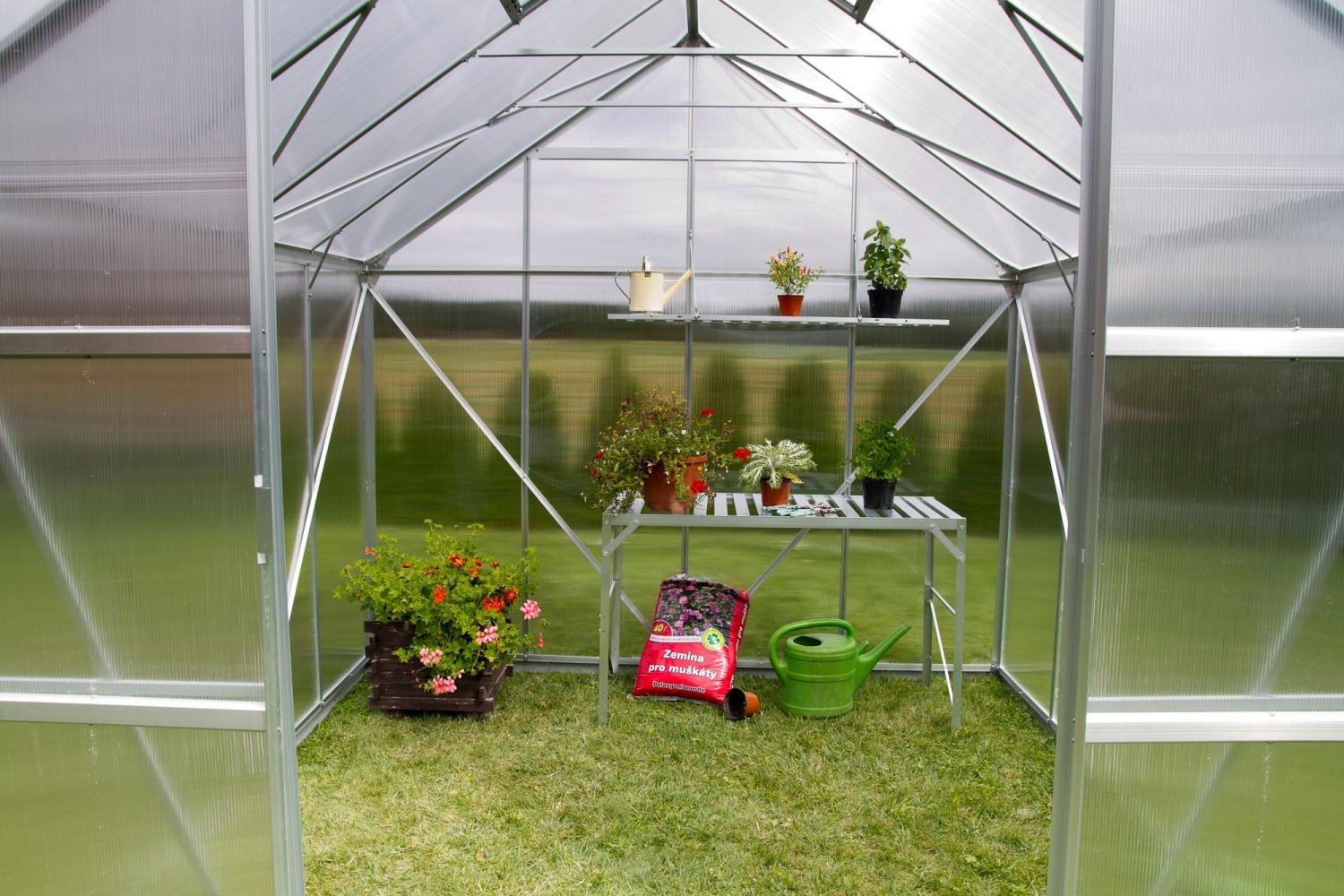 Obsahem balení jsou dvoukřídlé posuvné dveře (š x v otvoru = 1,22 x 1,91 m), AL profily, prosklení, 4x střešní ventilační okénko s manuálním otevíráním, veškerý spojovací materiál. Skleník lze postavit např. na zděnou podezdívku nebo na základnu z pozinkovaného plechu. Při stavbě bez podezdívky dokoupení základny doporučujeme. Ke skleníku je možné dokoupit řadu nadstandardního příslušenství - poličky, regály, další větrací střešní i boční okénka, automatické otvírače k těmto okénkům, okapové sady, teploměry, vlhkoměry, zavlažovací zařízení, elektrické odporové vytápění půdy.