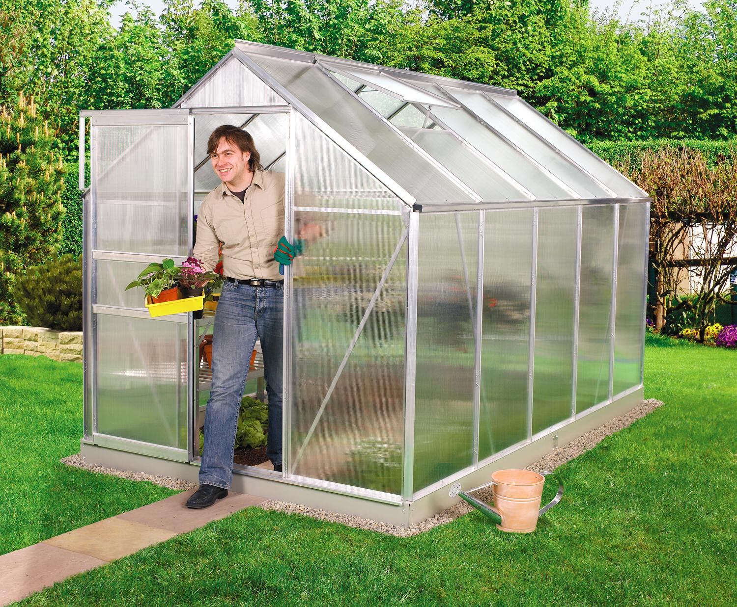 Obsahem balení jsou jednokřídlé posuvné dveře (š x v otvoru = 0,61 x 1,61 m), AL profily, prosklení, 2x střešní ventilační okénko s manuálním otevíráním, veškerý spojovací materiál. Skleník lze postavit např. na zděnou podezdívku nebo na základnu z pozinkovaného plechu. Při stavbě bez podezdívky dokoupení základny jednoznačně doporučujeme. Ke skleníku je možné dokoupit řadu nadstandardního příslušenství - poličky, regály, další větrací střešní i boční okénka, automatické otvírače k těmto okénkům, okapové sady, teploměry, vlhkoměry, zavlažovací zařízení, elektrické odporové vytápění půdy. Skleník dodáváme jako stavebnici s podrobným montážním návodem. Baleno v papírovém kartonu.