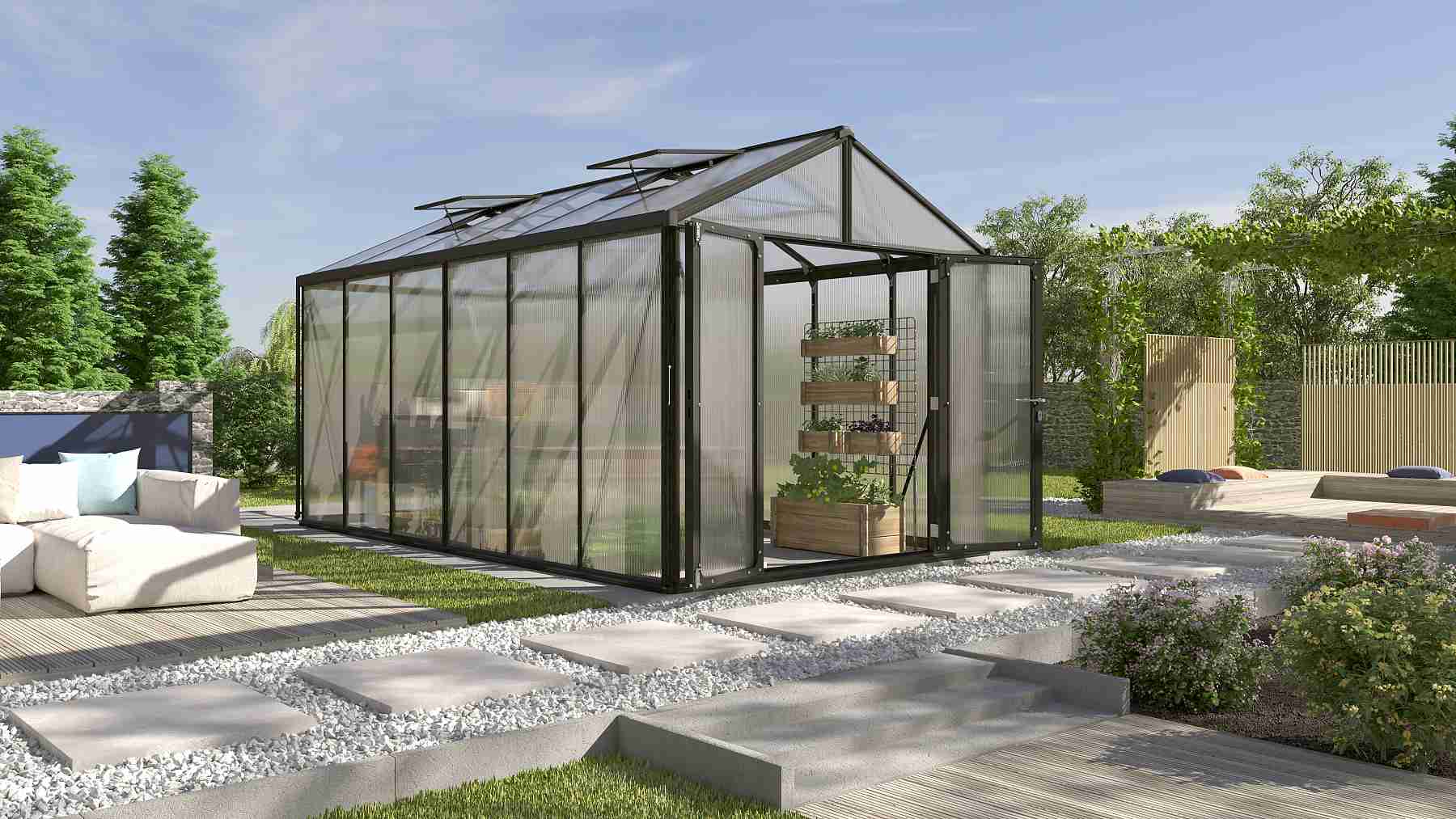 Velké a široké skleníky řady ZEUS COMFORT jsou zařazeny do kategorie PREMIUM - skleník je vyrobený značkovým výrobcem z Velké Británie. Skleník je vyrobený z masivních eloxovaných hliníkových profilů. Prosklení je z tepelně-izolačních komůrkových polykarbonátových desek síly 10 mm. Prosklení je ukotveno do konstrukce pomocí přítlačných hliníkových lišt (boční stěny) nebo je zasunuto do nosných profilů (střecha).