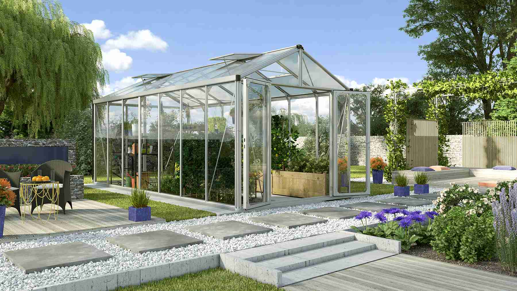 Skleníky řady ZEUS COMFORT jsou zařazeny do kategorie PREMIUM - skleník je vyrobený značkovým výrobcem z Velké Británie. Skleník je vyrobený z eloxovaných hliníkových profilů, prosklení je z kaleného čirého skla síly 3 mm. Čiré sklo zajišťuje výbornou světelnou propustnost, takže do skleníku je krásně vidět ze všech stran a kdykoliv se můžete pokochat pohledem na pěstovanou zeleninu nebo květiny. Prosklení střechy je z tepelně-izolačních komůrkových polykarbonátových desek o síle 10 mm. Prosklení je ukotveno do konstrukce pomocí přítlačných hliníkových lišt (boční stěny) nebo je zasunuto do nosných profilů (střecha).