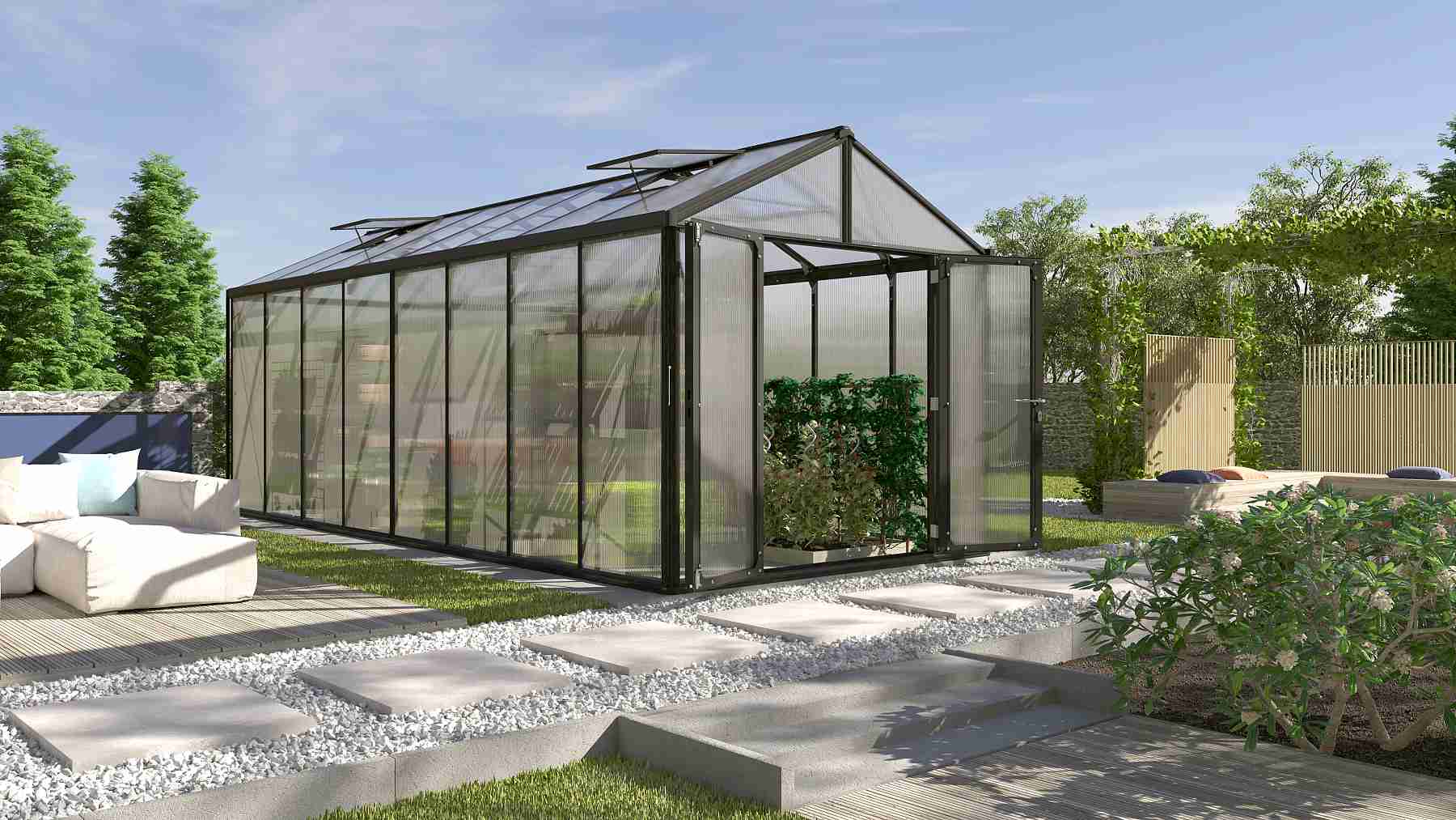 Velké a široké skleníky řady ZEUS COMFORT jsou zařazeny do kategorie PREMIUM - skleník je vyrobený značkovým výrobcem z Velké Británie. Skleník je vyrobený z masivních eloxovaných hliníkových profilů. Prosklení je z tepelně-izolačních komůrkových polykarbonátových desek síly 16 mm. Prosklení je ukotveno do konstrukce pomocí přítlačných hliníkových lišt (boční stěny) nebo je zasunuto do nosných profilů (střecha).