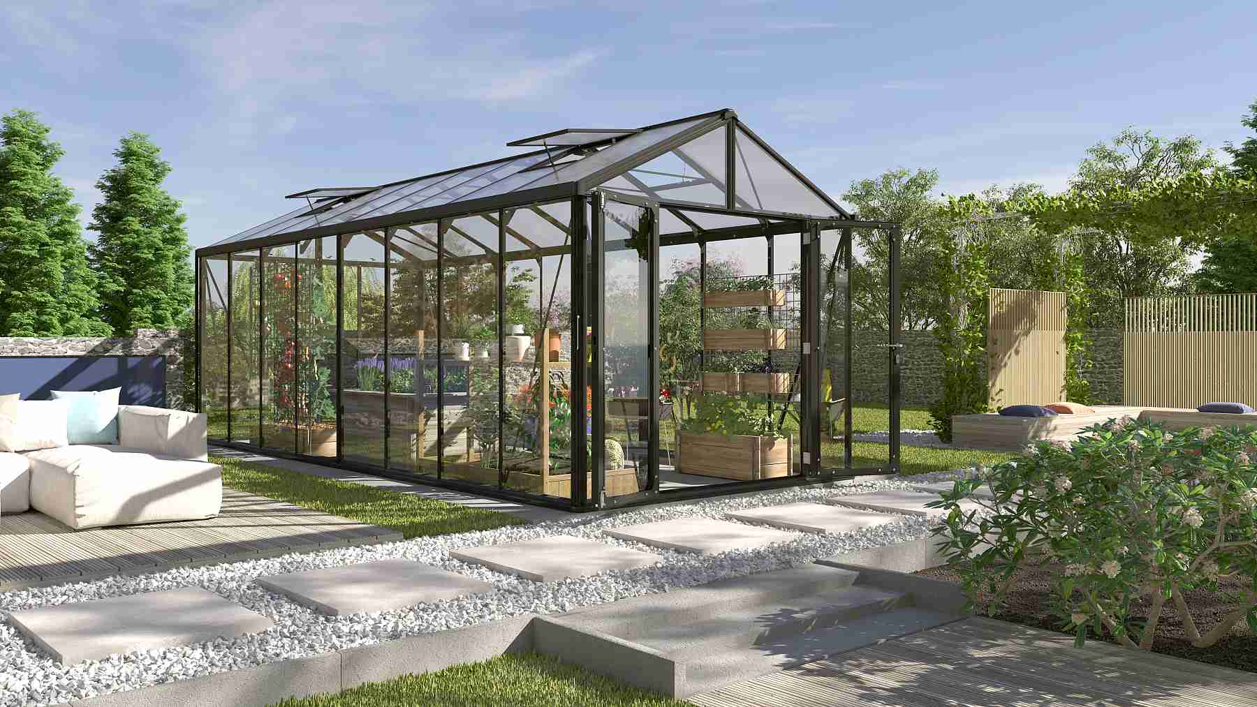 Skleníky řady ZEUS COMFORT jsou zařazeny do kategorie PREMIUM - skleník je vyrobený značkovým výrobcem z Velké Británie. Skleník je vyrobený z eloxovaných hliníkových profilů, prosklení je z kaleného čirého skla síly 3 mm. Čiré sklo zajišťuje výbornou světelnou propustnost, takže do skleníku je krásně vidět ze všech stran a kdykoliv se můžete pokochat pohledem na pěstovanou zeleninu nebo květiny. Prosklení střechy je z tepelně-izolačních komůrkových polykarbonátových desek o síle 10 mm. Prosklení je ukotveno do konstrukce pomocí přítlačných hliníkových lišt (boční stěny) nebo je zasunuto do nosných profilů (střecha).