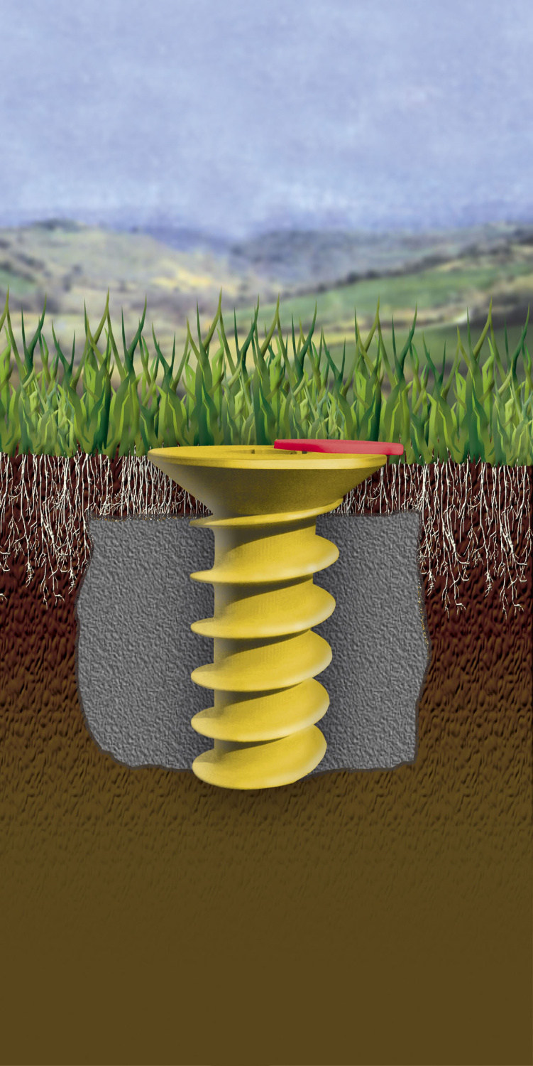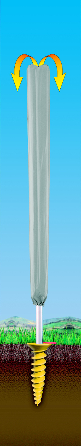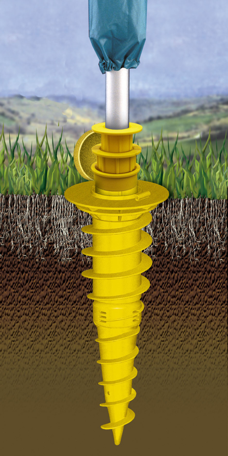 Dvojitý zemní šroub = ukotvení do země je vyřešeno pomocí delšího dvojitého plastového zemního šroubu. Ten se zašroubuje (zavrtá) do země a do něj se zasune nosná tyč sušáku. Není nutné nic betonovat. Výhodou zemního šroubu je možnost postavit sušák na zahradě kdekoliv, kde je možné zemní šroub zavrtat do země. Šroub je opatřen plastovým víčkem. Šroub se musí zavrtat do roviny s povrchem, pak je bezpečný i pro travní sekačku. K dokoupení jako doplňková výbava.
