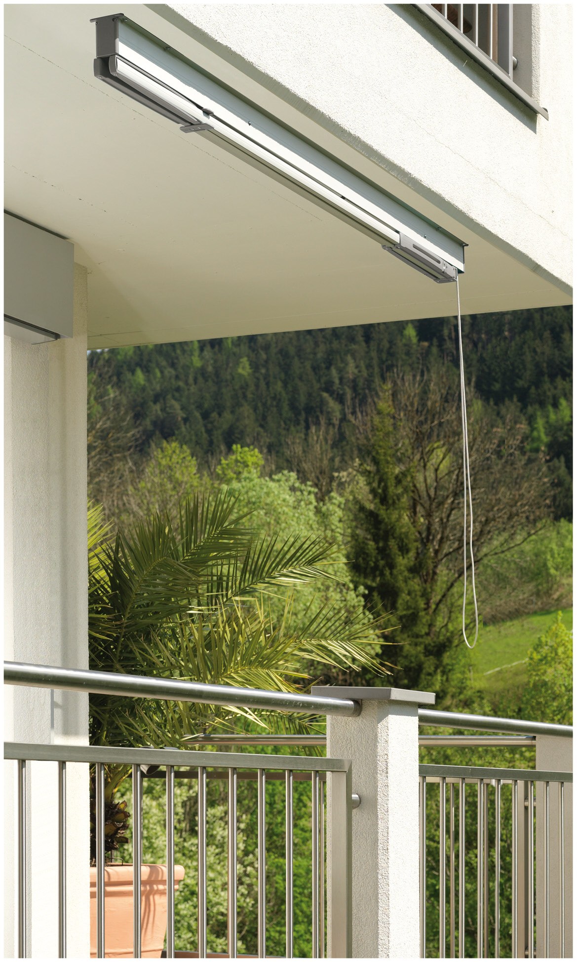 JUWEL SAMBA 200 - naprosto unikátní model balkonového sušáku na prádlo. Sušák připevníte na strop balkónu a pak jej v případě potřeby pouze stáhnete za lanko dolů. Po usušení prádla zase celý sušák jednoduše zatažením za lanko vytáhnete nahoru ke stropu, kde se složí do hliníkového pouzdra o rozměrech 10 x 10 x 200 cm.