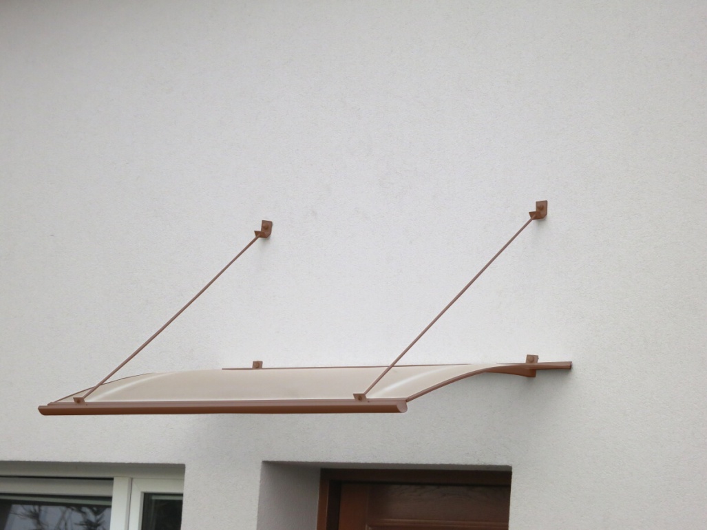 Stříška nad dveře vyrobená z práškově lakovaného hliníku. Na rozdíl od stříšek s plastovou konstrukcí hliníková konstrukce perfektně odolává vlivům počasí, i po letech je pevná a stabilní. V zimě mrazem nekřehne a ani na silném letním slunci nedochází ke změnám barvy. Stříška je zasklená komůrkovým polykarbonátem síly 4,5 mm s oboustranným UV filtrem (značka LEXAN® - vyrobeno v Rakousku). Jde o velmi kvalitní značkový polykarbonát od jednoho z nejlepších světových výrobců.