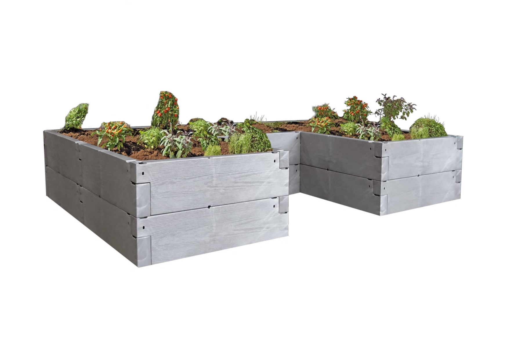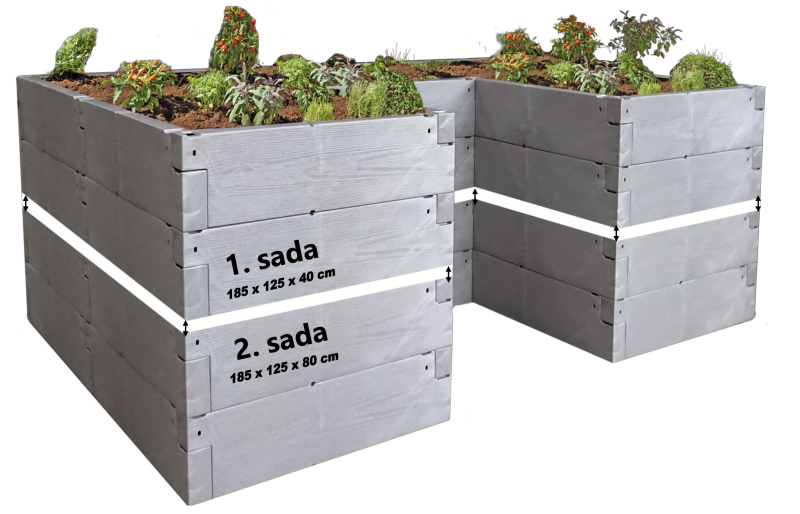 Dvoupatrový vyvýšený záhon JUWEL TIMBER ERGOLINE Vám rozšíří zahradní sezónu. Vyvýšený záhon vyniká nejen odolností vůči počasí, ale i moderním designem podobným šedému dřevu. Na rozdíl od dřevěných záhonů není nutné provádět nátěr, neodlamují se třísky ani nedochází k zahnívání materiálu. Tento model záhonu je složen ze dvou vrstev (pater) plastových "kamenů". Každé patro je složeno ze 12-ti "kamenů", tj. celkem 24 kamenů. Jednotlivé kameny se do sebe zasouvají a uvnitř jsou propojeny několika silnými kovovými dráty proti roztažení vlivem hmotnosti zeminy (proti soudkovitému efektu), takže výsledný záhon vyniká vysokou robustností a stabilitou. Vyvýšený záhon JUWEL TIMBER ERGOLINE je možné sestavit do různých variant sestav. Záhon je možné dodatečně vybavit zábranami proti šnekům. JUWEL TIMBER ERGOLINE nemá pevné dno.