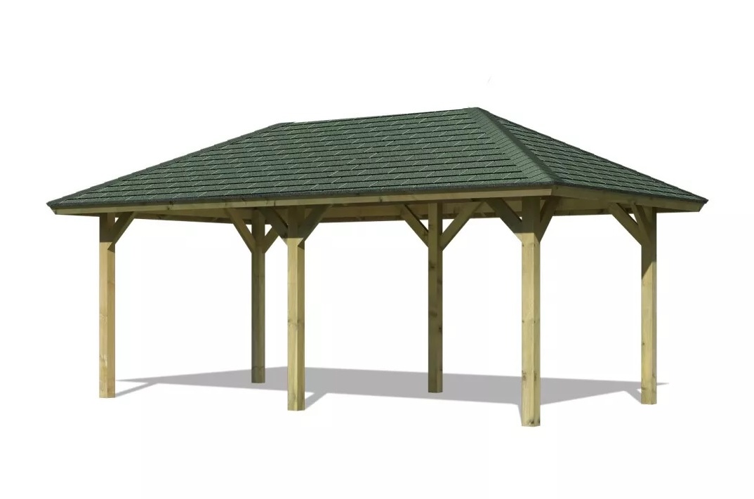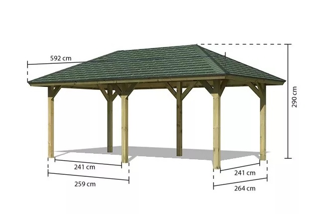 Pavilon má základní obdelníkový tvar a díky vnitřnímu rozměru 4,94 x 2,41 m nabízí dostatek prostoru pro letní posezení, grilování, relaxaci i rodinnou oslavu. Celková zastřešená plocha je 5,92 x 3,40 m. Výška boku je 1,99 m a výška hřebene 2,9 m. Šest sloupků 11,5 x 11,5 cm podpírají střechu s masivními příčnými podpěrami. Konstrukce altánu je tlakově impregnována a je tak dobře chráněna proti dřevokazným houbám i hmyzu, ale i proti nepříznivým povětrnostním podmínkám. Impregnace je zdravotně nezávadná a naprosto bezpečná. Vzhledem k velkým plochám střechy a zatížení větrem je nutné připevnit altán k zemi pomocí odpovídajících H kotev v délce cca 60 cm (nejsou obsahem dodávky).