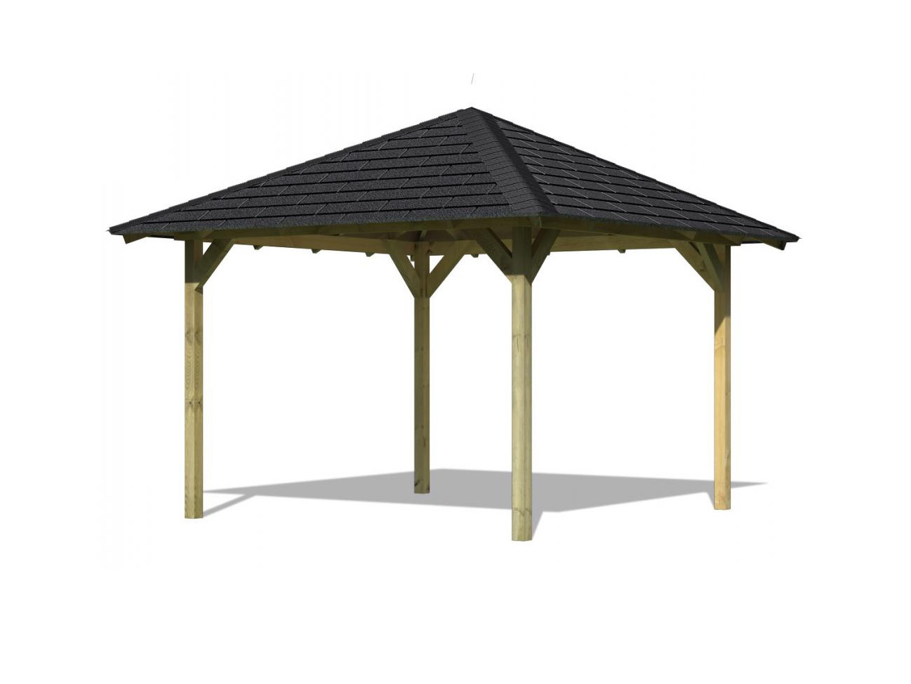 Pavilon má základní čtvercový tvar a díky vnitřnímu rozměru 2,71 x 2,71 m nabízí dostatek prostoru pro letní posezení, grilování, relaxaci i rodinnou oslavu. Celková zastřešená plocha je 3,57 x 3,57 m. Výška boku je 1,99 m a výška hřebene 2,97 m. Čtyři sloupky 9 x 9 cm podpírají střechu s masivními příčnými podpěrami. Konstrukce altánu je tlakově impregnována a je tak dobře chráněna proti dřevokazným houbám i hmyzu, ale i proti nepříznivým povětrnostním podmínkám. Impregnace je zdravotně nezávadná a naprosto bezpečná. Vzhledem k velkým plochám střechy a zatížení větrem je nutné připevnit altán k zemi pomocí odpovídajících H kotev v délce cca 60 cm (nejsou obsahem dodávky).