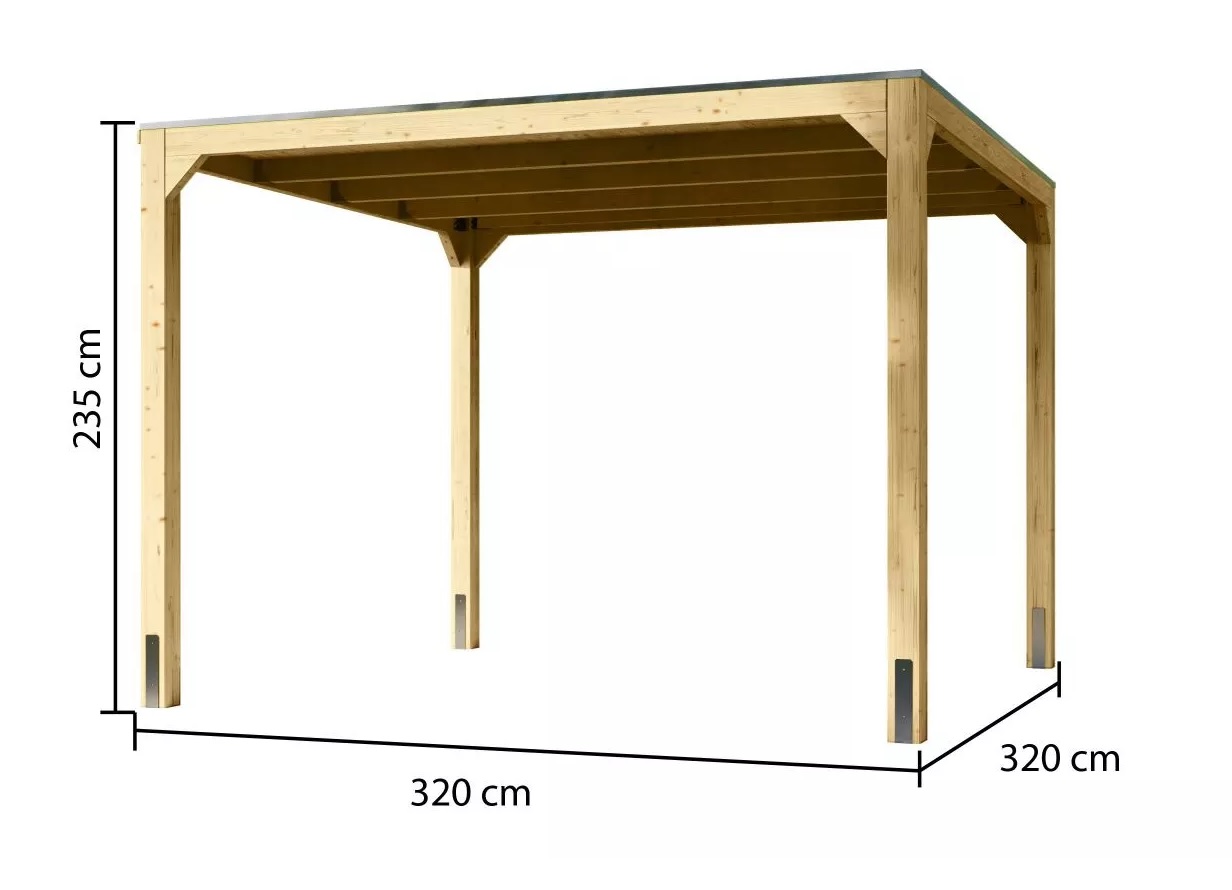 Altán má základní čtvercový tvar a díky vnitřnímu rozměru 3,07 x 3,07 m nabízí dostatek prostoru pro letní posezení, grilování, relaxaci i rodinnou oslavu. Celková zastřešená plocha je 3,20 x 3,20 m. Výška boku je 2,27 m a výška hřebene 2,39 m. Čtyři sloupky 12 x 12 cm podpírají střechu s masivními příčnými podpěrami. Vzhledem k velkým plochám střechy a zatížení větrem je nutné připevnit altán k zemi pomocí odpovídajících H kotev v délce cca 60 cm (nejsou obsahem dodávky).