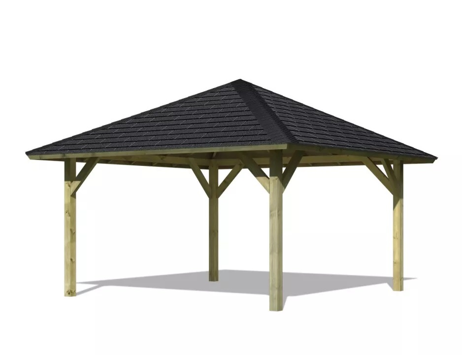 Pavilon má základní čtvercový tvar a díky vnitřnímu rozměru 3,36 x 3,36 m nabízí dostatek prostoru pro letní posezení, grilování, relaxaci i rodinnou oslavu. Celková zastřešená plocha je 4,31 x 4,31 m. Výška boku je 1,96 m a výška hřebene 3,15 m. Čtyři sloupky 11,5 x 11,5 cm podpírají střechu s masivními příčnými podpěrami. Konstrukce altánu je tlakově impregnována a je tak dobře chráněna proti dřevokazným houbám i hmyzu, ale i proti nepříznivým povětrnostním podmínkám. Impregnace je zdravotně nezávadná a naprosto bezpečná. Vzhledem k velkým plochám střechy a zatížení větrem je nutné připevnit altán k zemi pomocí odpovídajících H kotev v délce cca 60 cm (nejsou obsahem dodávky).