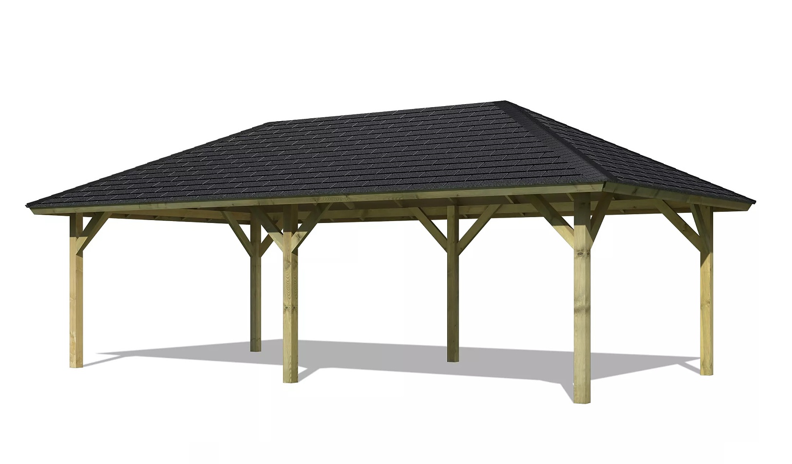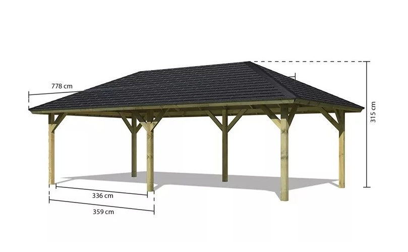 Pavilon má základní obdelníkový tvar a díky vnitřnímu rozměru 6,82 x 3,36 m nabízí dostatek prostoru pro letní posezení, grilování, relaxaci i rodinnou oslavu. Celková zastřešená plocha je 7,78 x 4,31 m. Výška boku je 1,96 m a výška hřebene 3,15 m. Šest sloupků 11,5 x 11,5 cm podpírají střechu s masivními příčnými podpěrami. Konstrukce altánu je tlakově impregnována a je tak dobře chráněna proti dřevokazným houbám i hmyzu, ale i proti nepříznivým povětrnostním podmínkám. Impregnace je zdravotně nezávadná a naprosto bezpečná. Vzhledem k velkým plochám střechy a zatížení větrem je nutné připevnit altán k zemi pomocí odpovídajících H kotev v délce cca 60 cm (nejsou obsahem dodávky).