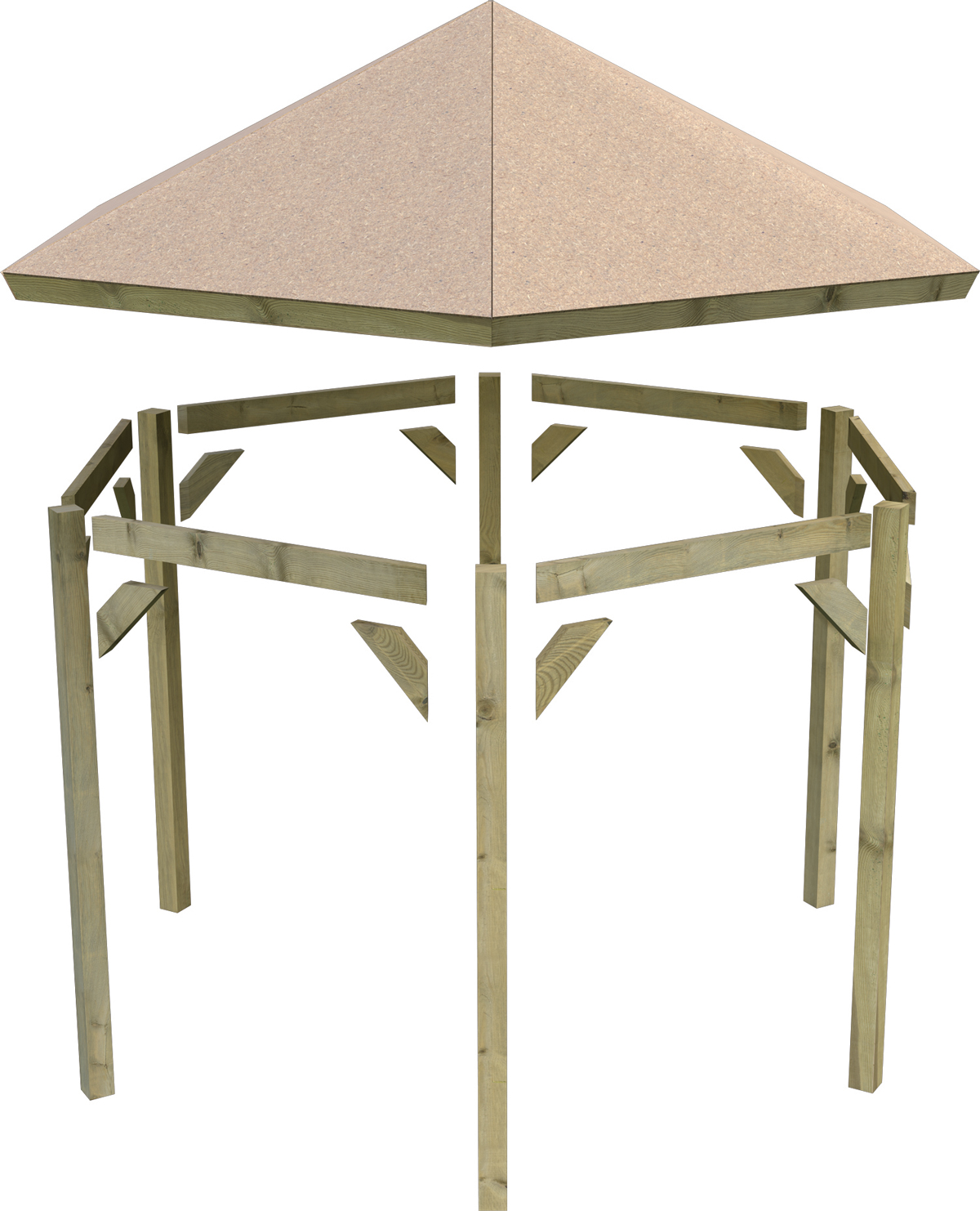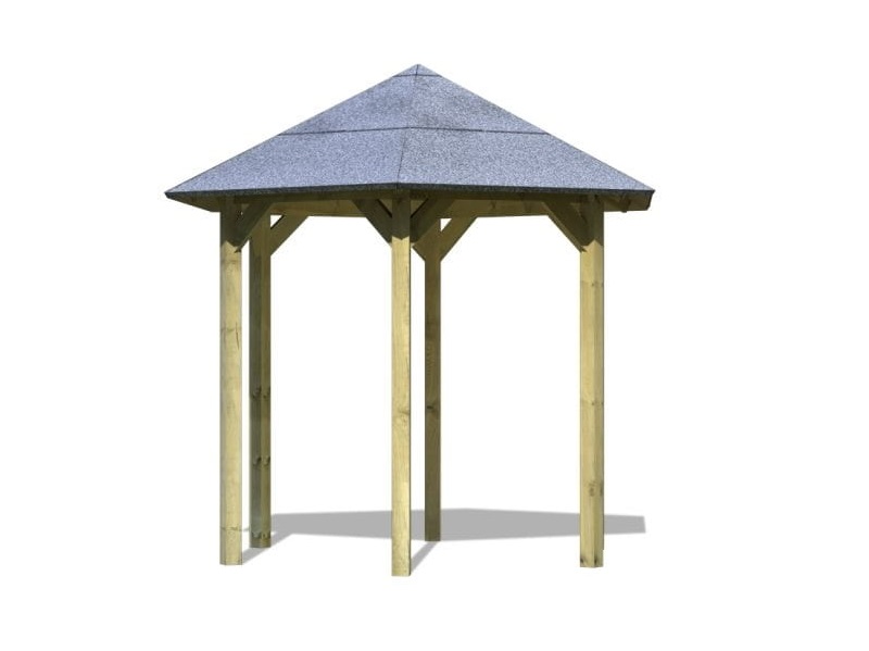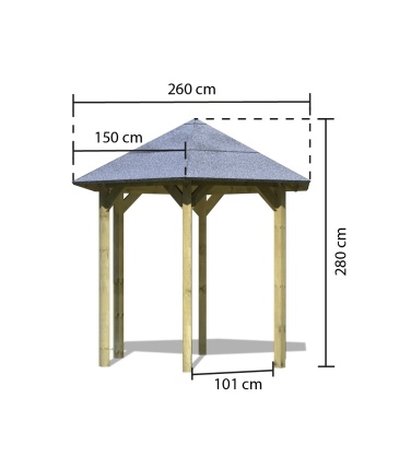 Pavilon má šestiboký tvar a slouží jako místo odpočinku pro dvě osoby. Šest sloupků 9 x 9 cm podpírá střechu s masivními příčnými podpěrami. Konstrukce altánu je tlakově impregnována a je tak dobře chráněna proti dřevokazným houbám i hmyzu, ale i proti nepříznivým povětrnostním podmínkám. Impregnace je zdravotně nezávadná a naprosto bezpečná. Vzhledem k velkým plochám střechy a zatížení větrem je nutné připevnit altán k zemi pomocí odpovídajících H kotev v délce cca 60 cm (nejsou obsahem dodávky).