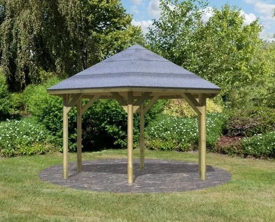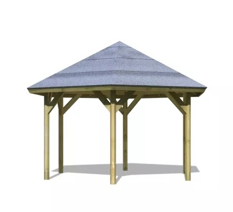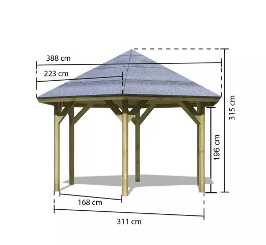 Pavilon má šestiboký tvar a slouží jako místo odpočinku. Šest sloupků 11,5 x 11,5 cm podpírá střechu s masivními příčnými podpěrami. Konstrukce altánu je tlakově impregnována a je tak dobře chráněna proti dřevokazným houbám i hmyzu, ale i proti nepříznivým povětrnostním podmínkám. Impregnace je zdravotně nezávadná a naprosto bezpečná. Vzhledem k velkým plochám střechy a zatížení větrem je nutné připevnit altán k zemi pomocí odpovídajících H kotev v délce cca 60 cm (nejsou obsahem dodávky).