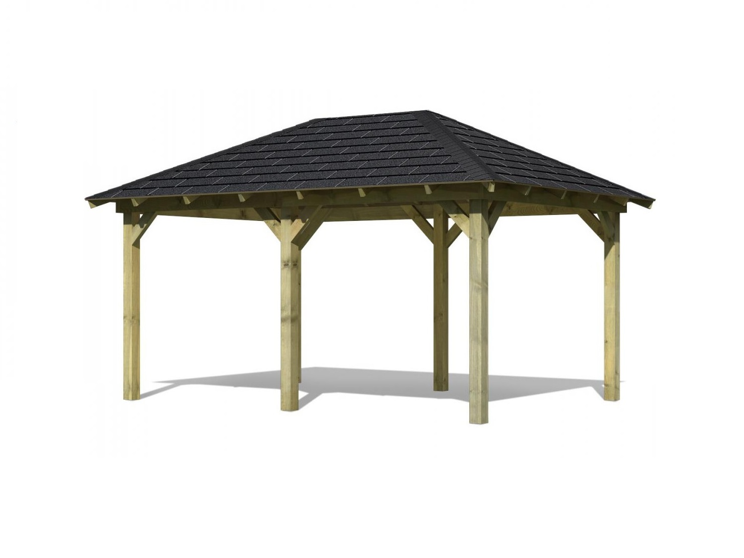 Pavilon má základní obdélníkový tvar a díky vnitřnímu rozměru 2,71 m x 4,11 cm nabízí dostatek prostoru pro letní posezení, grilování, relaxaci i rodinnou oslavu. Celková zastřešená plocha je 3,45 x 4,85 m. Výška boční stěny je 2,10 m a výška hřebene 2,96 m. Šest masivních sloupků 9 x 9 cm podpírá střechu s masivními příčnými podpěrami. Konstrukce altánu je tlakově impregnována a je tak dobře chráněna proti dřevokazným houbám i hmyzu, ale i proti nepříznivým povětrnostním podmínkám. Impregnace je zdravotně nezávadná a naprosto bezpečná. Vzhledem k velkým plochám střechy a zatížení větrem je nutné připevnit altán k zemi pomocí odpovídajících H kotev v délce cca 60 cm (nejsou obsahem dodávky).