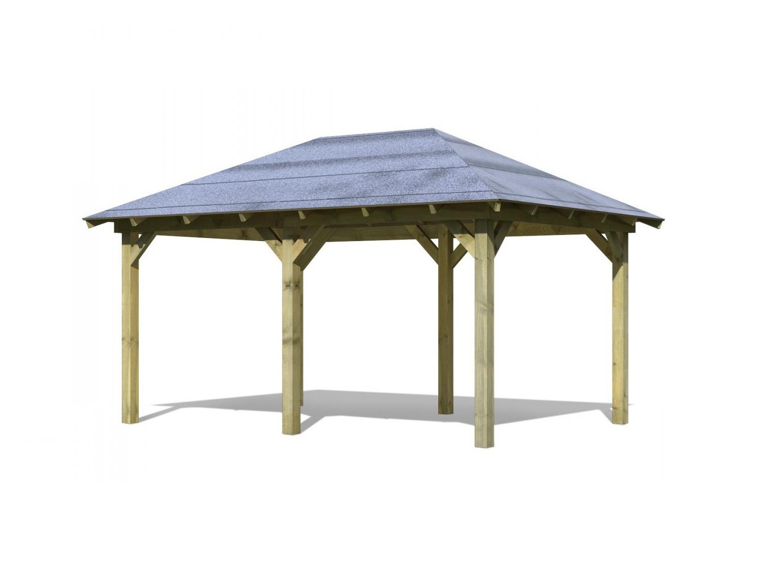 Pavilon má základní obdélníkový tvar a díky vnitřnímu rozměru 2,71 x 4,11 m nabízí dostatek prostoru pro letní posezení, grilování, relaxaci i rodinnou oslavu. Celková zastřešená plocha je 3,45 x 4,85 m. Výška boku je 2,10 m a výška hřebene 2,96 m. Šest masivních sloupků 9 x 9 cm podpírá střechu s masivními příčnými podpěrami. Konstrukce altánu je tlakově impregnována a je tak dobře chráněna proti dřevokazným houbám i hmyzu, ale i proti nepříznivým povětrnostním podmínkám. Impregnace je zdravotně nezávadná a naprosto bezpečná. Vzhledem k velkým plochám střechy a zatížení větrem je nutné připevnit altán k zemi pomocí odpovídajících H kotev v délce cca 60 cm (nejsou obsahem dodávky).