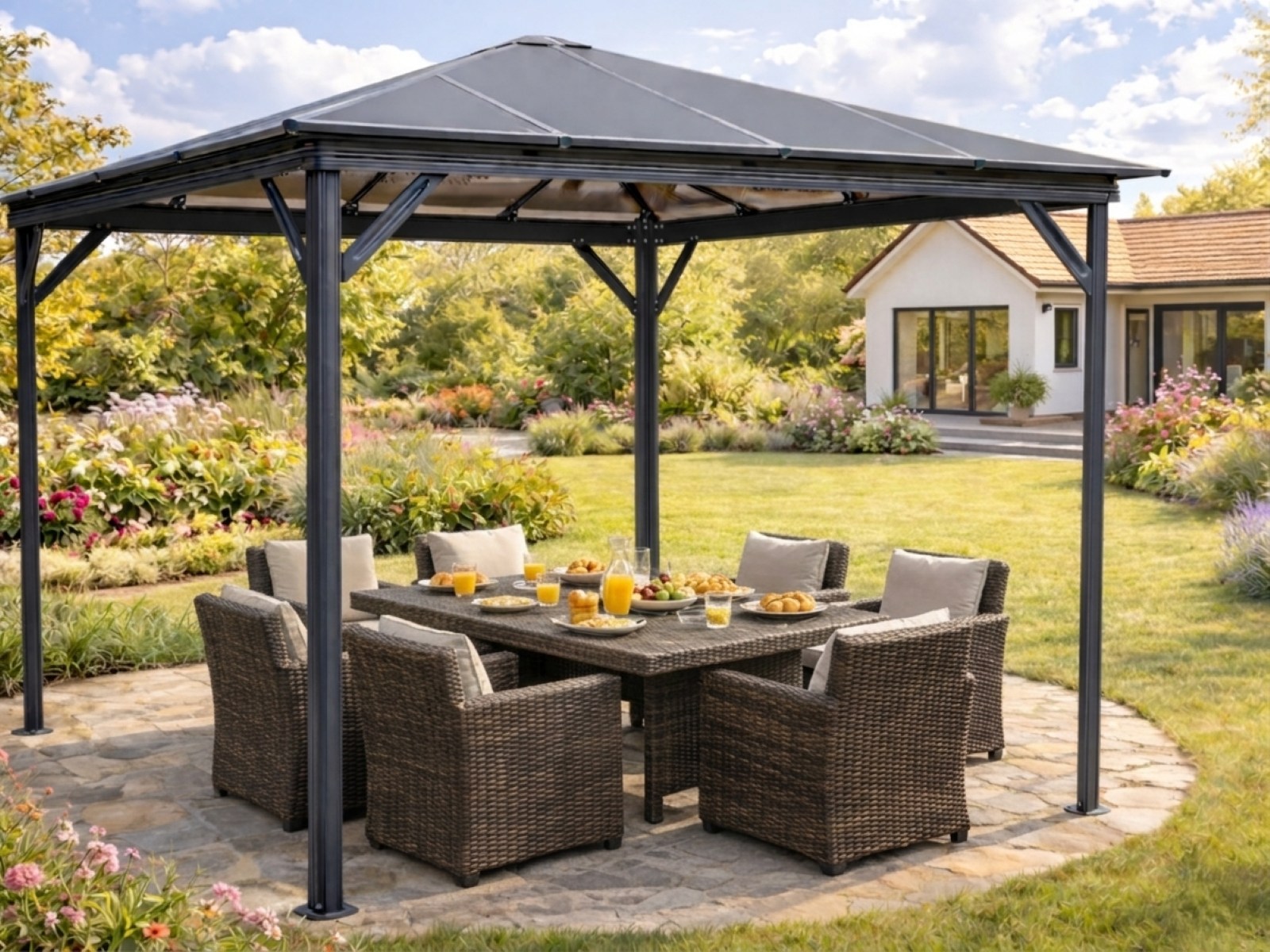 Zahradní hliníkový altán LANITPLAST 33 poskytuje potřebný stín pro posezení na zahradě. Nejedná se o běžný lehký altán s trubkovou skládací konstrukcí (jako je běžně ke koupi v hobbymarketech), ale o masivní výrobek zhotovený ze silných vzájemně sešroubovaných hliníkových profilů (síla 1,0 mm) určený k pevné montáži k zemi pomocí patek. Hliníkové profily jsou ochráněny práškovou vypalovací barvou v tmavě šedém odstínu - antracit. Spojky jednotlivých profilů jsou vyrobené z lakovaného pozinkovaného ocelového plechu 1,5 mm. Z důvodu zajištění maximální kvality je výhradně použit kvalitní polykarbonát MARLON (výrobce Brett Martin Velká Británie), který v ČR prošel náročnými testy ve státem akreditovaných zkušebnách jako stavební materiál. Smluvní prodloužená záruka 10 let na nerozbitnost polykarbonátu krupobitím je u produktů od LANIT PLASTU samozřejmostí. Střecha tohoto modelu altánu je vyrobena z čirého komůrkového polykarbonátu 6 mm.