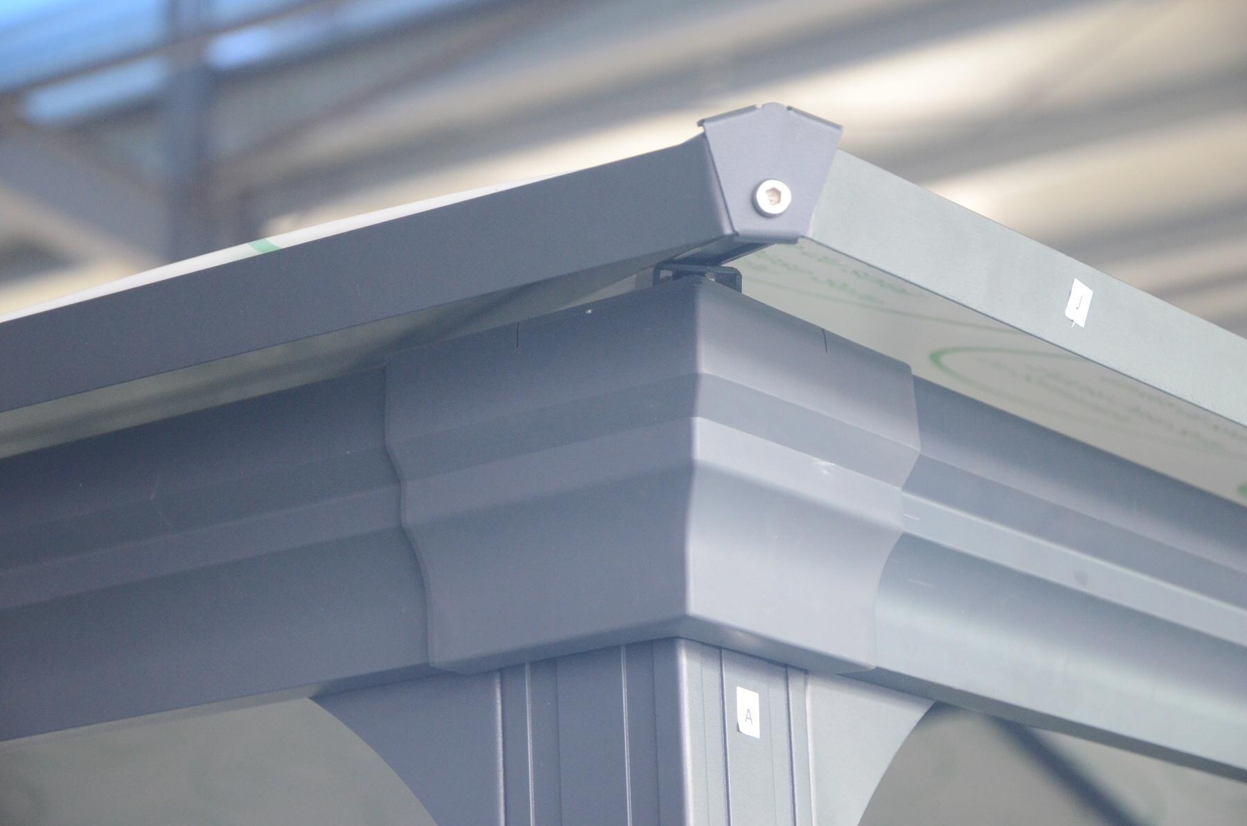 Zahradní hliníkový altán LANITPLAST 33 poskytuje potřebný stín pro posezení na zahradě. Nejedná se o běžný lehký altán s trubkovou skládací konstrukcí (jako je běžně ke koupi v hobbymarketech), ale o masivní výrobek zhotovený ze silných vzájemně sešroubovaných hliníkových profilů (síla 1,0 mm) určený k pevné montáži k zemi pomocí patek. Hliníkové profily jsou ochráněny práškovou vypalovací barvou v tmavě šedém odstínu - antracit. Spojky jednotlivých profilů jsou vyrobené z lakovaného pozinkovaného ocelového plechu 1,5 mm. Z důvodu zajištění maximální kvality je výhradně použit kvalitní polykarbonát MARLON (výrobce Brett Martin Velká Británie), který v ČR prošel náročnými testy ve státem akreditovaných zkušebnách jako stavební materiál. Smluvní prodloužená záruka 10 let na nerozbitnost polykarbonátu krupobitím je u produktů od LANIT PLASTU samozřejmostí. Střecha tohoto modelu altánu je vyrobena z čirého komůrkového polykarbonátu 6 mm.