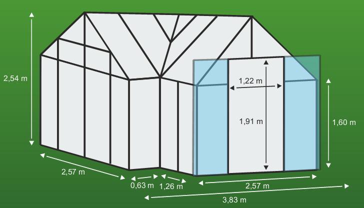 Obsahem balení jsou dvoukřídlé posuvné dveře (š x v otvoru = 1,22 x 1,91 m), plechová základna, AL profily, prosklení, 4x střešní ventilační okénko s manuálním otevíráním, 3 okapové svody, veškerý spojovací materiál. Skleník lze postavit buď na zděnou (betonovou, jinou) podezdívku nebo na základnu z pozinkovaného plechu (je obsahem dodávky). Ke skleníku je možné dokoupit řadu nadstandardního příslušenství - poličky, regály, další větrací střešní i boční okénka, automatické otvírače k těmto okénkům, okapové sady, teploměry, vlhkoměry, zavlažovací zařízení, elektrické odporové vytápění půdy. Baleno v papírovém kartonu. Prosklení je zabalené v nevratné dřevěné bedně.