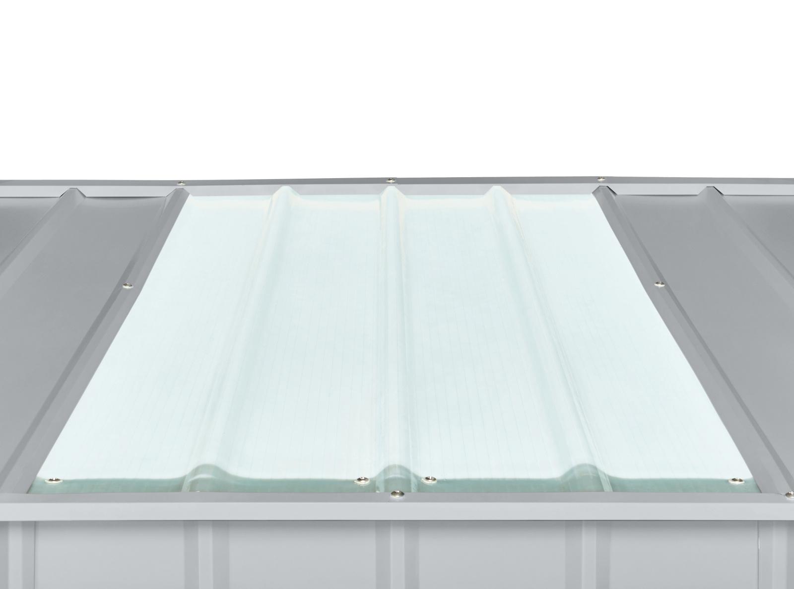 Tento domek GLOBEL se od běžné produkce odlišuje jedinečným prosvětlením střechy. Pevné zabudované střešní okno je vyrobené tak, že jeden plechový díl střechy je nahrazen rozměrově shodným dílem ze sklolaminátu. Díky prosvětlení střechy je v domku dostatek světla.