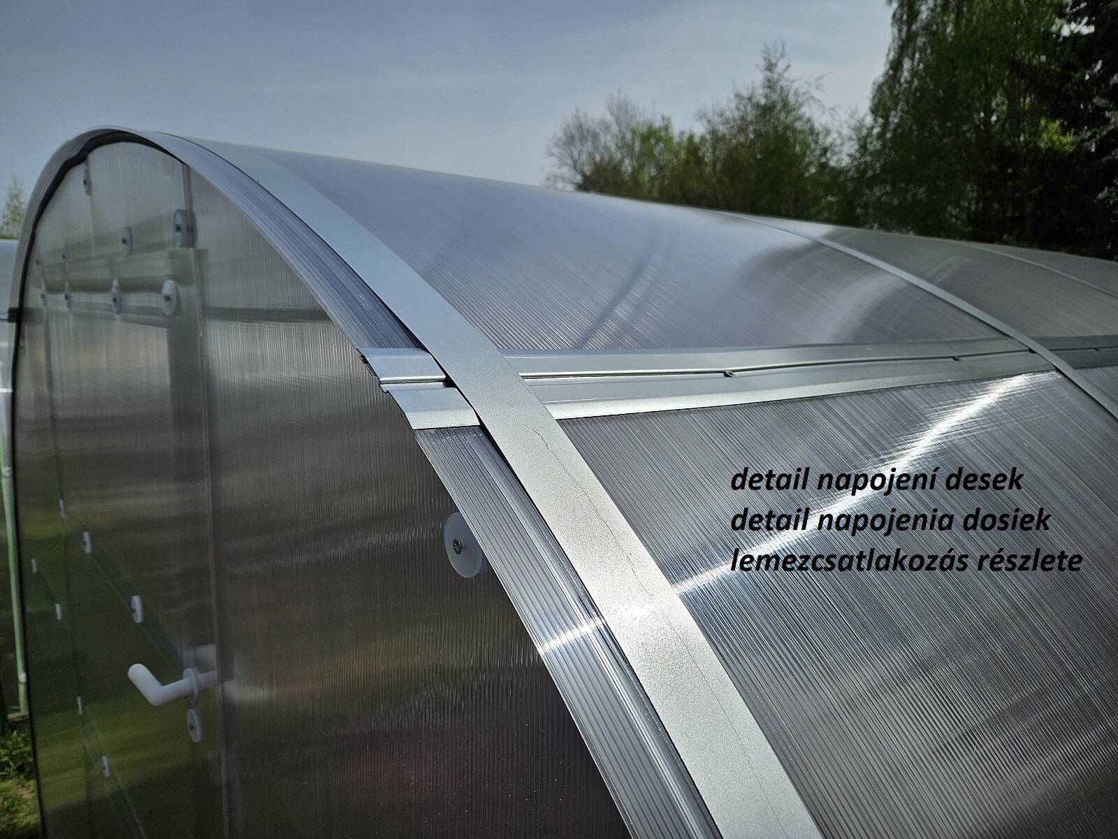Tento model skleníku obsahuje ocelové vodorovné spojovací lišty na plastové prosklení, takže polykarbonátové desky jsou dodávané už předřezáné na menší formáty (max. 1,05 x 2 m) a zabalené v kartonu. Z těchto menších formátů lze už velice jednoduše dořezat potřebné zaoblené dílce pro opláštění. Nemusíte tak složitě manipulovat s celými velkými polykarbonátovými deskami. Skleník lze i mnohem jednodušeji uskladnit. DOPORUČUJEME!