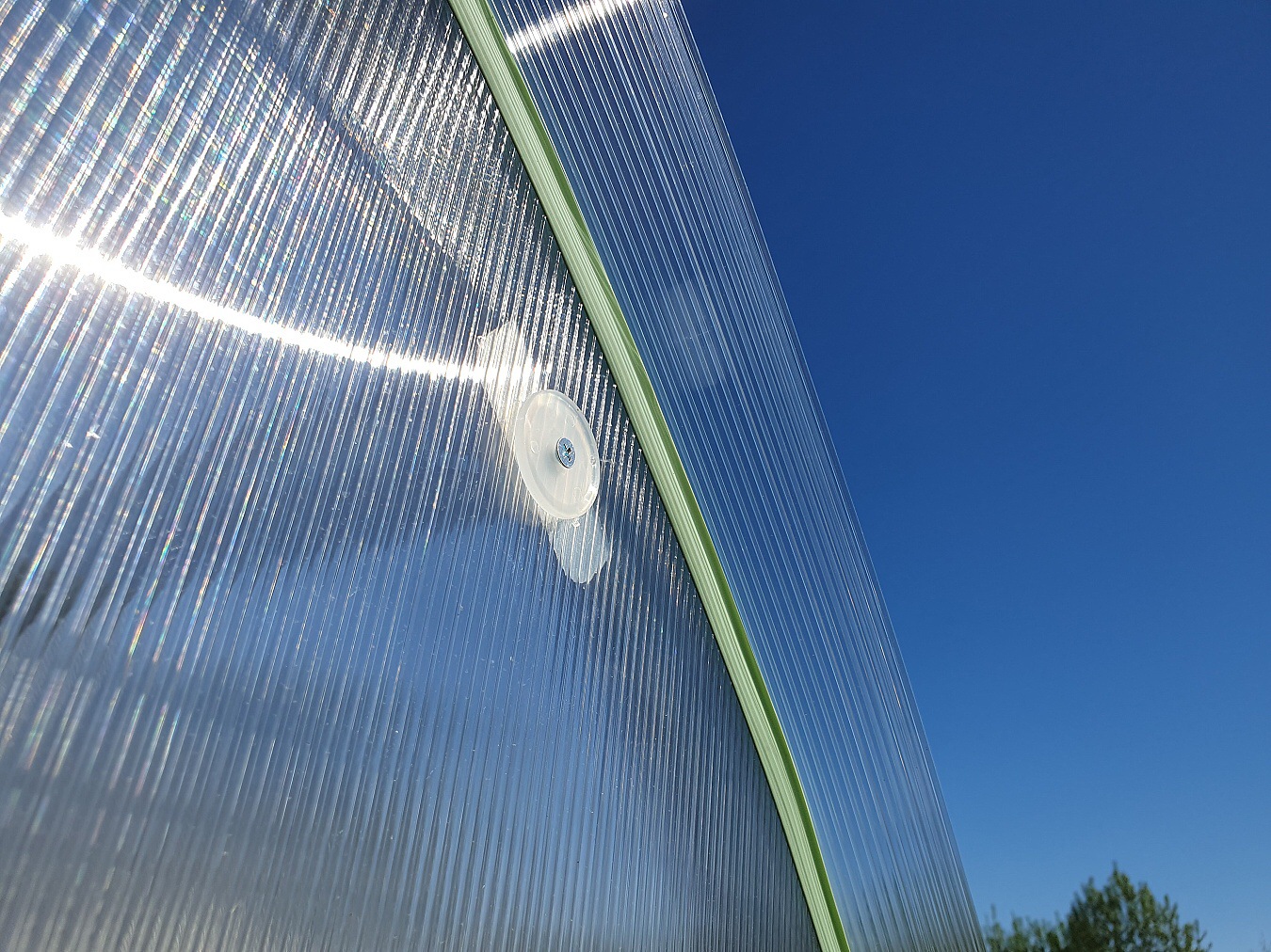 Prémiový britský dvoustěnný polykarbonát 6 mm se silným UV filtrem (proto na slunci nežloutne a nekřehne). Z důvodu zajištění maximální kvality skleníku dodáváme ke konstrukci prosklení z kvalitního polykarbonátu MARLON (výrobce Brett Martin Velká Británie), který v ČR prošel náročnými testy ve státem akreditovaných zkušebnách jako stavební materiál. Navíc disponuje zkušebním protokolem ze Státního zdravotního ústavu Praha, který potvrzuje, že se z polykarbonátu neuvolňují žádné škodlivé látky. Můžete tak nerušeně pěstovat zeleninu bez obav o své zdraví. Smluvní prodloužená záruka 10 let na nerozbitnost polykarbonátu krupobitím je u skleníků od LANIT PLASTU samozřejmostí.
