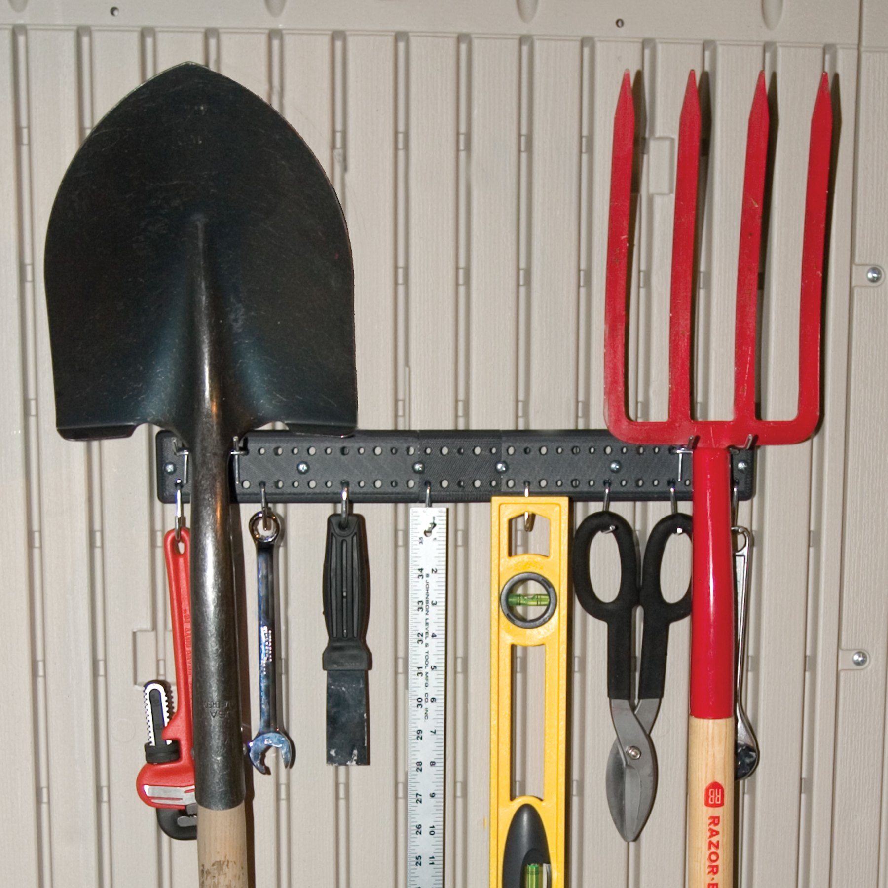 - 2x upevňovací kovová lišta na zahradní nářadí