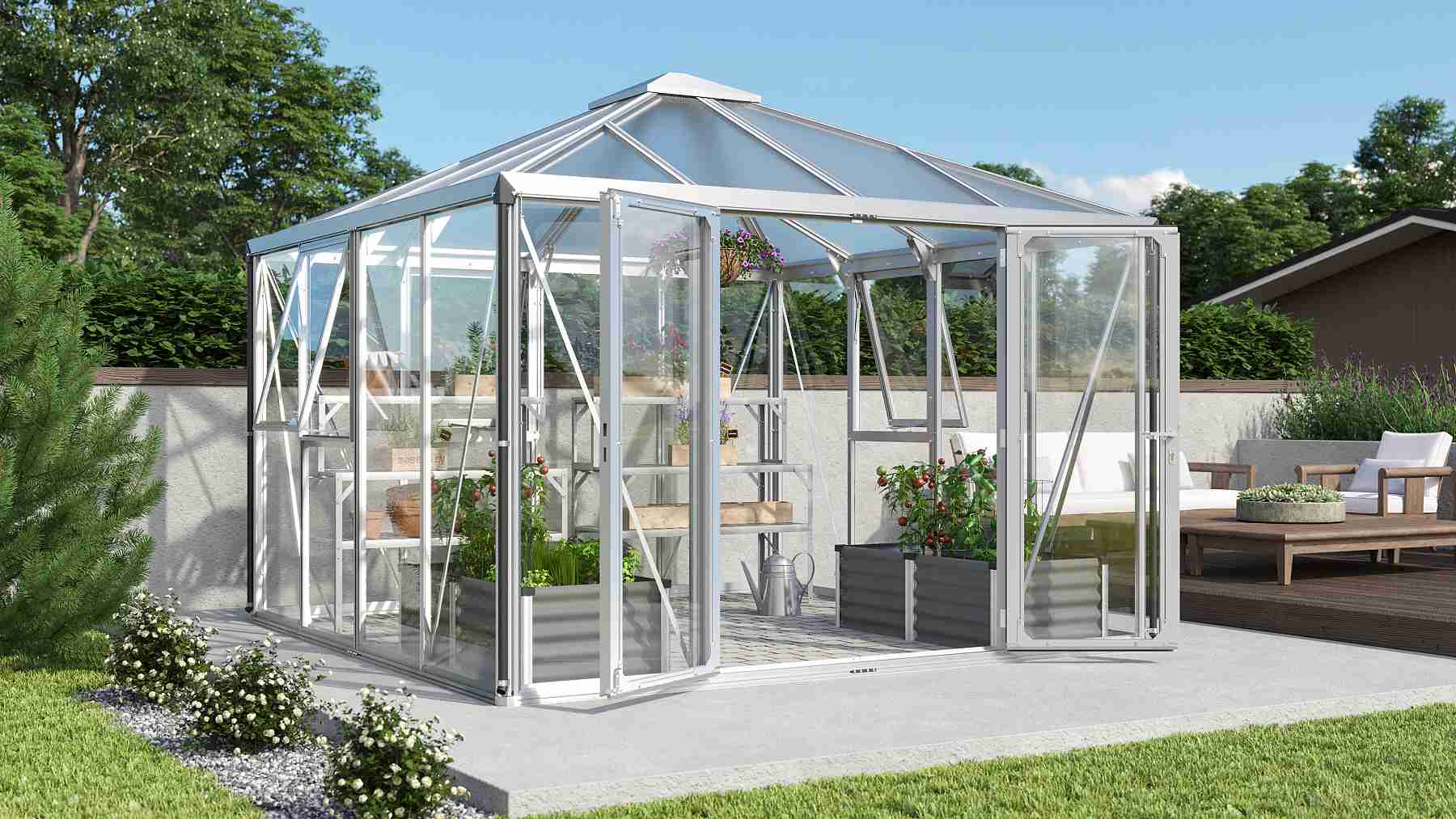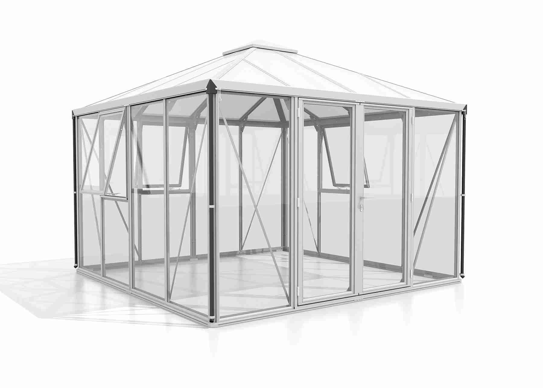 Skleníky řady FORTUNA jsou zařazeny do kategorie PREMIUM - skleník je vyrobený značkovým výrobcem z Velké Británie. Skleník je vyrobený z eloxovaných hliníkových profilů, prosklení je z kaleného čirého skla síly 3 mm. Čiré sklo zajišťuje výbornou světelnou propustnost, takže do skleníku je krásně vidět ze všech stran a kdykoliv se můžete pokochat pohledem na pěstovanou zeleninu nebo květiny. Prosklení střechy je z tepelně-izolačních komůrkových polykarbonátových desek o síle 10 mm. Dvojité rámové profily obepínají velké tabule skla / polykarbonátu po stranách bez rušivých kotvicích pomůcek, jako jsou zasklívací spony.